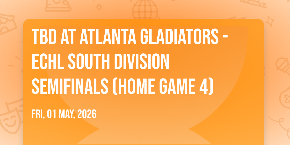 📍 Location: 33.9896, -84.0942🌟 Journey into wonder at TBD at Atlanta Gladiators - ECHL South Division Semifinals (Home Game 4), where extraordinary experiences await around every corner! 🏛️ Set against the backdrop of Gas South Arena in dynamic Duluth, GA, this event promises to exceed all expectations. 📅 Join us on May 1st, 2026 at 07:30 AM for a celebration that combines innovation, entertainment, and community spirit in perfect harmony. ✨ There will be an atmosphere where memories are made and stories come alive, ensuring every guest experiences something truly remarkable. 🎊 This is more than just an event; it's a journey into the extraordinary!