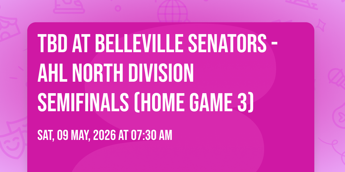๐ Location: 44.188, -77.3836โจ Discover the extraordinary at TBD at Belleville Senators - AHL North Division Semifinals (Home Game 3), where magic meets reality in ways you've never imagined! ๐๏ธ Set in CAA Arena nestled in bustling Belleville, ON, this event promises to be a landmark occasion. ๐ Taking place on May 9th, 2026 at 07:30 AM, it's going to create an atmosphere where every moment becomes a cherished memory. ๐ Immerse yourself in an experience crafted with attention to every detail, designed to surprise and delight at every turn. They have worked tirelessly to ensure this event exceeds all expectations, bringing together elements of entertainment, innovation, and pure joy. ๐ Don't miss your chance to be part of this remarkable journey!