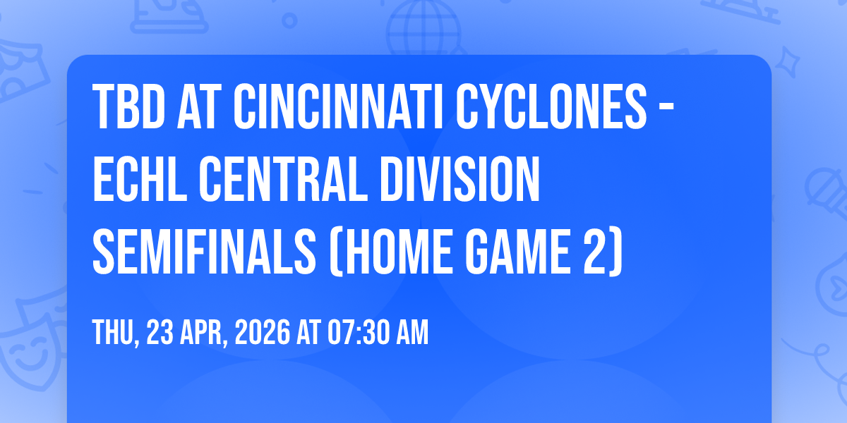 📍 Location: 39.098, -84.5045🎉 Welcome to TBD at Cincinnati Cyclones - ECHL Central Division Semifinals (Home Game 2), where the impossible becomes possible and dreams take flight! 🏛️ Join us at Heritage Bank Center in the heart of Cincinnati, OH for an event that will redefine your expectations. 📅 On April 23rd, 2026 at 07:30 AM, witness the transformation of space and time into something truly magical. ✨ It's a curated experience combining the best of innovation, entertainment, and community spirit, creating moments that will be remembered for years to come. Whether you're a first-time visitor or a seasoned enthusiast, prepare to be amazed. 🎊 Book now to ensure your place in this unforgettable experience!
