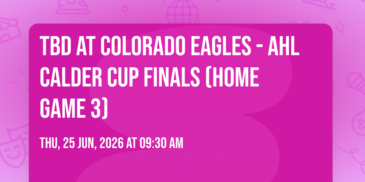 📍 Location: 40.4436, -104.99✨ Discover the extraordinary at TBD at Colorado Eagles - AHL Calder Cup Finals (Home Game 3), where magic meets reality in ways you've never imagined! 🏛️ Set in Blue Federal Credit Union Arena nestled in bustling Loveland, CO, this event promises to be a landmark occasion. 📅 Taking place on June 25th, 2026 at 09:30 AM, it's going to create an atmosphere where every moment becomes a cherished memory. 🌟 Immerse yourself in an experience crafted with attention to every detail, designed to surprise and delight at every turn. They have worked tirelessly to ensure this event exceeds all expectations, bringing together elements of entertainment, innovation, and pure joy. 🎊 Don't miss your chance to be part of this remarkable journey!