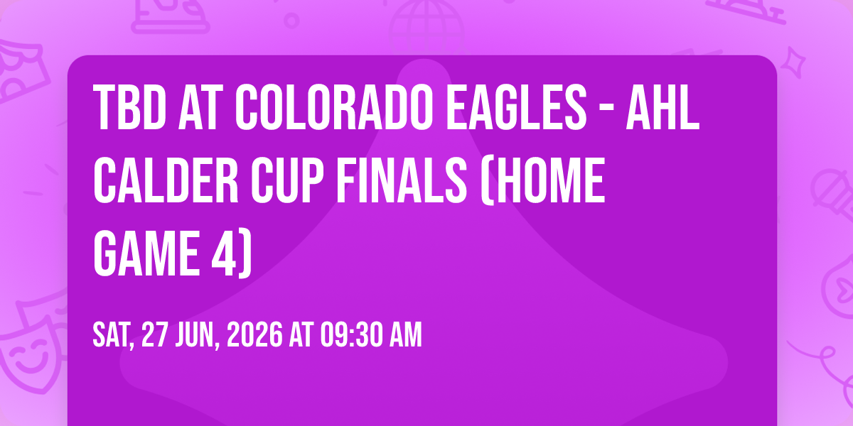 📍 Location: 40.4436, -104.99✨ Embark on an extraordinary journey at TBD at Colorado Eagles - AHL Calder Cup Finals (Home Game 4), where every moment promises to be unforgettable! 🌟 Imagine of transforming Blue Federal Credit Union Arena in the heart of Loveland, CO into a realm of endless possibilities. 📅 Join us on June 27th, 2026 at 09:30 AM for an experience that will challenge your imagination and exceed your expectations. 🎯 This carefully curated event combines the finest elements of entertainment, innovation, and community spirit. Whether you're an adventure seeker, culture enthusiast, or someone looking for unique experiences, this event offers something special for everyone. 🎊 Don't miss this chance to be part of something extraordinary!