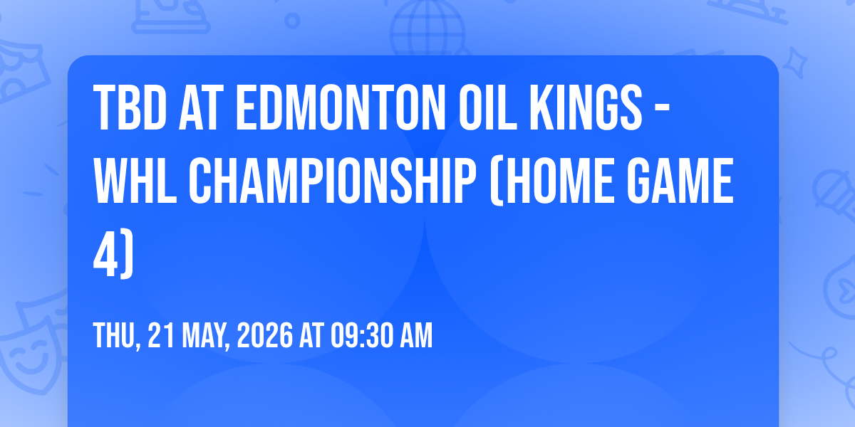 📍 Location: 53.547, -113.498🎉 Welcome to TBD at Edmonton Oil Kings - WHL Championship (Home Game 4), where dreams come alive and possibilities are endless! 🏛️ Join us at Rogers Place in the heart of Edmonton, AB for an event that defies expectations. 📅 On May 21st, 2026 at 09:30 AM, be part of something truly extraordinary as we bring together innovation, entertainment, and pure magic. ✨ Every aspect has been carefully designed to ensure an unforgettable experience for all our guests. Whether you're seeking adventure, inspiration, or simply a break from the ordinary, this event promises to deliver beyond your wildest dreams. 🎊 Prepare for a journey into the extraordinary!