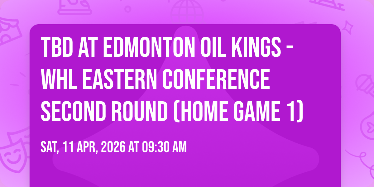 📍 Location: 53.547, -113.498🎉 Welcome to TBD at Edmonton Oil Kings - WHL Eastern Conference Second Round (Home Game 1), where the impossible becomes possible and dreams take flight! 🏛️ Join us at Rogers Place in the heart of Edmonton, AB for an event that will redefine your expectations. 📅 On April 11th, 2026 at 09:30 AM, witness the transformation of space and time into something truly magical. ✨ It's a curated experience combining the best of innovation, entertainment, and community spirit, creating moments that will be remembered for years to come. Whether you're a first-time visitor or a seasoned enthusiast, prepare to be amazed. 🎊 Book now to ensure your place in this unforgettable experience!