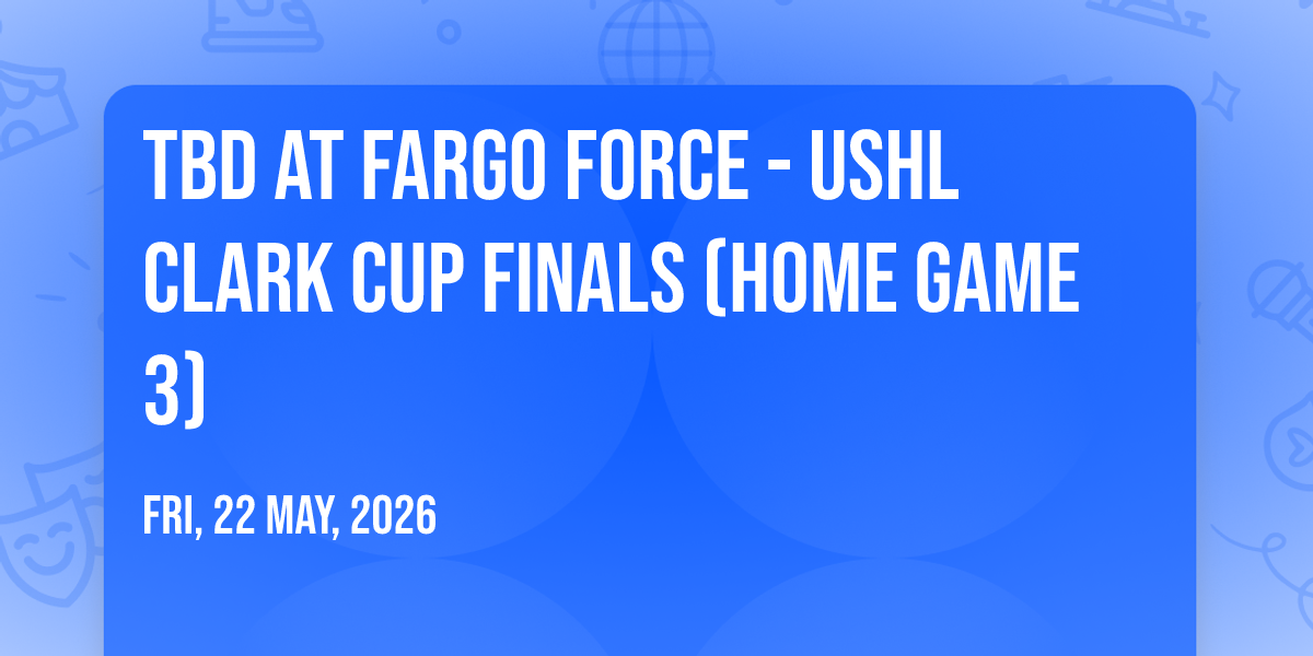 📍 Location: 46.8355, -96.8755🎉 Prepare to be amazed at TBD at Fargo Force - USHL Clark Cup Finals (Home Game 3), the most anticipated gathering of the season! 🌟 Set against the stunning backdrop of Scheels Arena in vibrant Fargo, ND, this event promises to redefine your expectations. 📅 Mark your calendars for May 22nd, 2026 at 08:30 AM and get ready to immerse yourself in an atmosphere of wonder and excitement. ✨ From the moment you arrive, you'll be transported into a world where memories are made and stories come alive. They have crafted an experience that perfectly harmonizes entertainment, innovation, and community spirit. 🌈 Join us as we create moments that will be discussed for years!