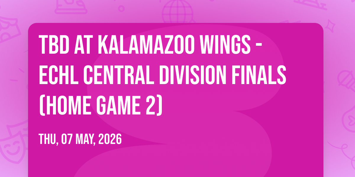 📍 Location: 42.2537, -85.5354🌟 Step into a world of wonder at TBD at Kalamazoo Wings - ECHL Central Division Finals (Home Game 2), where extraordinary moments await! 🏛️ Located at Wings Event Center in dynamic Kalamazoo, MI, this event will become the talk of the town. 📅 Join us on May 7th, 2026 at 07:30 AM for a celebration that defies the ordinary. ✨ This curated experience brings together the best of entertainment, culture, and community spirit. Every detail has been thoughtfully planned to ensure an unforgettable experience for all our guests. 🎯 Take advantage of this opportunity to be part of something special. 🎊 Early registration is recommended as space is limited!