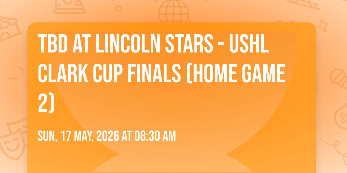 📍 Location: 40.8329, -96.6972✨ Enter a world of endless possibilities at TBD at Lincoln Stars - USHL Clark Cup Finals (Home Game 2), where every moment tells a story! 🏛️ The stunning The Ice Box in vibrant Lincoln, NE transforms into a realm of wonder on May 17th, 2026 at 08:30 AM. 🌟 They have crafted an experience that goes beyond the ordinary, combining elements of surprise, delight, and pure entertainment. Every detail has been thoughtfully considered to ensure your journey with us is nothing short of extraordinary. 🎯 Join fellow adventure seekers and memory makers in this celebration of imagination and innovation. 🎊 Reserve your spot today and be part of something truly special!