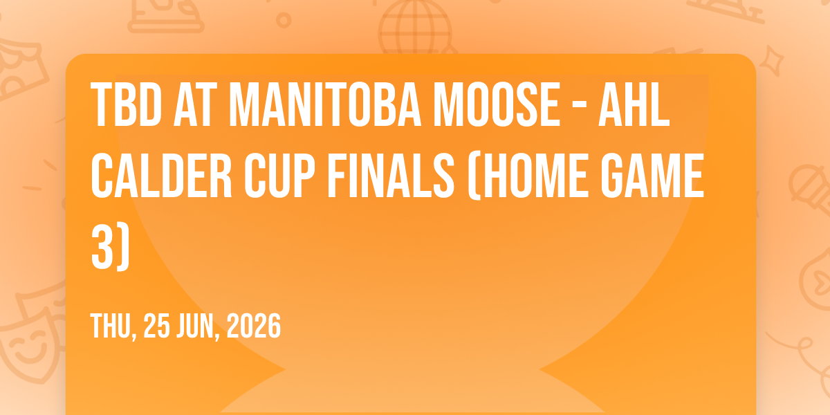 📍 Location: 49.8936, -97.1435🎉 Welcome to TBD at Manitoba Moose - AHL Calder Cup Finals (Home Game 3), where dreams come alive and possibilities are endless! 🏛️ Join us at Canada Life Centre in the heart of Winnipeg, MB for an event that defies expectations. 📅 On June 25th, 2026 at 08:30 AM, be part of something truly extraordinary as we bring together innovation, entertainment, and pure magic. ✨ Every aspect has been carefully designed to ensure an unforgettable experience for all our guests. Whether you're seeking adventure, inspiration, or simply a break from the ordinary, this event promises to deliver beyond your wildest dreams. 🎊 Prepare for a journey into the extraordinary!