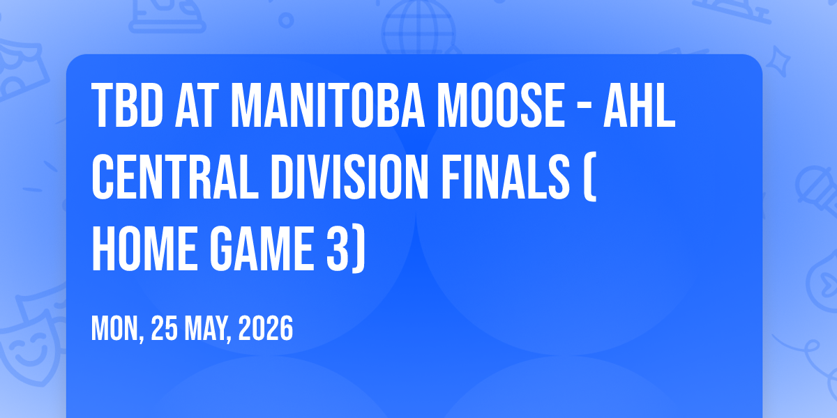 📍 Location: 49.8936, -97.1435✨ Embark on an extraordinary journey at TBD at Manitoba Moose - AHL Central Division Finals (Home Game 3), where every moment promises to be unforgettable! 🌟 Imagine of transforming Canada Life Centre in the heart of Winnipeg, MB into a realm of endless possibilities. 📅 Join us on May 25th, 2026 at 08:30 AM for an experience that will challenge your imagination and exceed your expectations. 🎯 This carefully curated event combines the finest elements of entertainment, innovation, and community spirit. Whether you're an adventure seeker, culture enthusiast, or someone looking for unique experiences, this event offers something special for everyone. 🎊 Don't miss this chance to be part of something extraordinary!