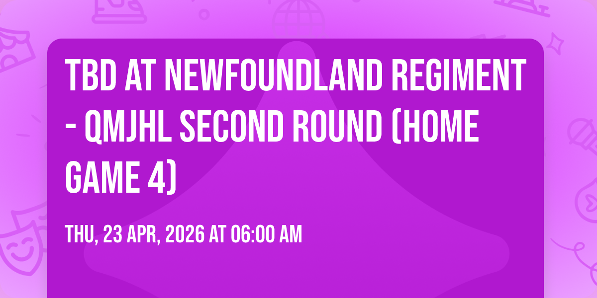 📍 Location: 47.5606, -52.7134🎉 Prepare to be amazed at TBD at Newfoundland Regiment - QMJHL Second Round (Home Game 4), the most anticipated gathering of the season! 🌟 Set against the stunning backdrop of Mary Brown's Centre in vibrant St. John's, NF, this event promises to redefine your expectations. 📅 Mark your calendars for April 23rd, 2026 at 06:00 AM and get ready to immerse yourself in an atmosphere of wonder and excitement. ✨ From the moment you arrive, you'll be transported into a world where memories are made and stories come alive. They have crafted an experience that perfectly harmonizes entertainment, innovation, and community spirit. 🌈 Join us as we create moments that will be discussed for years!