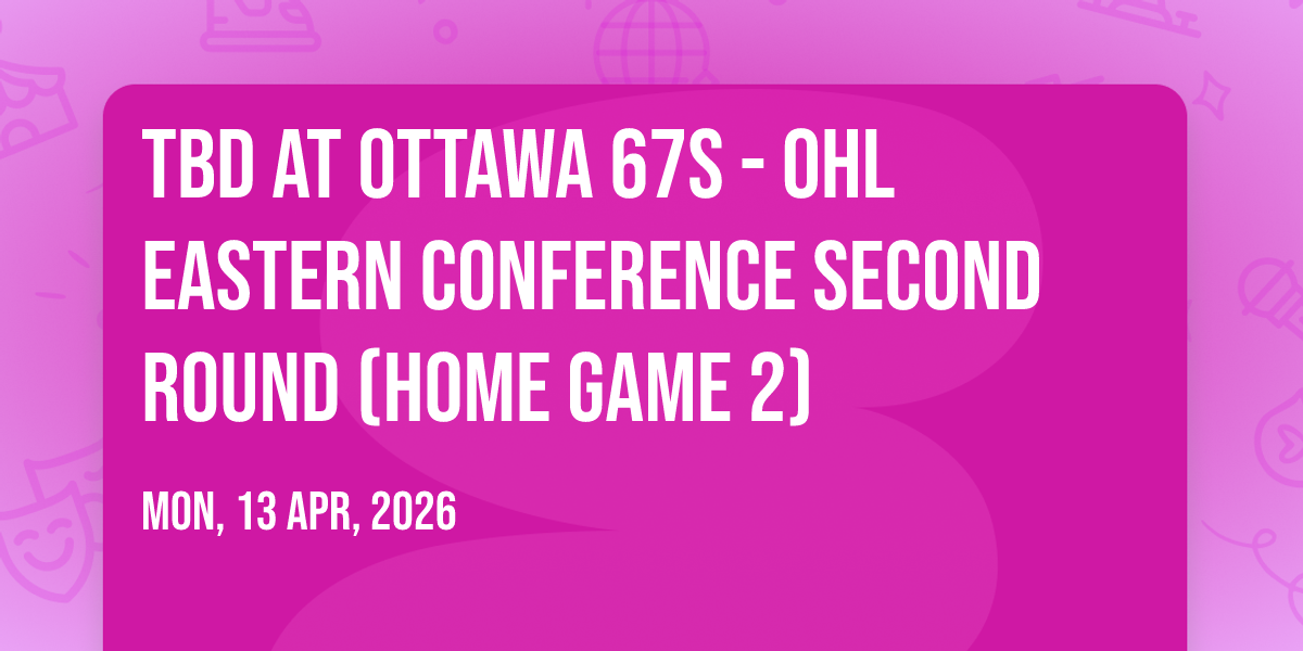 📍 Location: 45.3981, -75.6836✨ Enter a world of endless possibilities at TBD at Ottawa 67s - OHL Eastern Conference Second Round (Home Game 2), where every moment tells a story! 🏛️ The stunning The Arena at TD Place in vibrant Ottawa, ON transforms into a realm of wonder on April 13th, 2026 at 07:30 AM. 🌟 They have crafted an experience that goes beyond the ordinary, combining elements of surprise, delight, and pure entertainment. Every detail has been thoughtfully considered to ensure your journey with us is nothing short of extraordinary. 🎯 Join fellow adventure seekers and memory makers in this celebration of imagination and innovation. 🎊 Reserve your spot today and be part of something truly special!