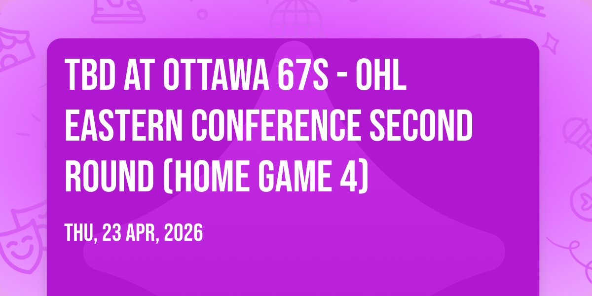 π Location: 45.3981, -75.6836β¨ Discover the extraordinary at TBD at Ottawa 67s - OHL Eastern Conference Second Round (Home Game 4), where magic meets reality in ways you've never imagined! ποΈ Set in The Arena at TD Place nestled in bustling Ottawa, ON, this event promises to be a landmark occasion. π Taking place on April 23rd, 2026 at 07:30 AM, it's going to create an atmosphere where every moment becomes a cherished memory. π Immerse yourself in an experience crafted with attention to every detail, designed to surprise and delight at every turn. They have worked tirelessly to ensure this event exceeds all expectations, bringing together elements of entertainment, innovation, and pure joy. π Don't miss your chance to be part of this remarkable journey!