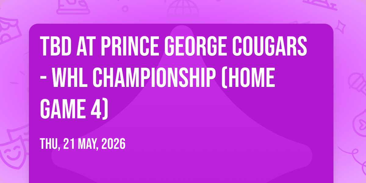 📍 Location: 53.9069, -122.798🌟 Journey into wonder at TBD at Prince George Cougars - WHL Championship (Home Game 4), where extraordinary experiences await around every corner! 🏛️ Set against the backdrop of CN Centre in dynamic Prince George, BC, this event promises to exceed all expectations. 📅 Join us on May 21st, 2026 at 10:30 AM for a celebration that combines innovation, entertainment, and community spirit in perfect harmony. ✨ There will be an atmosphere where memories are made and stories come alive, ensuring every guest experiences something truly remarkable. 🎊 This is more than just an event; it's a journey into the extraordinary!