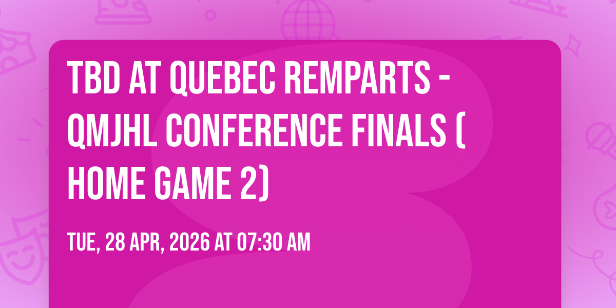 📍 Location: 46.8127, -71.2105🎉 Welcome to TBD at Quebec Remparts - QMJHL Conference Finals (Home Game 2), where the impossible becomes possible and dreams take flight! 🏛️ Join us at Videotron Centre in the heart of Quebec, QC for an event that will redefine your expectations. 📅 On April 28th, 2026 at 07:30 AM, witness the transformation of space and time into something truly magical. ✨ It's a curated experience combining the best of innovation, entertainment, and community spirit, creating moments that will be remembered for years to come. Whether you're a first-time visitor or a seasoned enthusiast, prepare to be amazed. 🎊 Book now to ensure your place in this unforgettable experience!