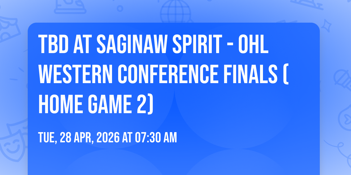📍 Location: 43.4355, -83.9362🌟 Journey into wonder at TBD at Saginaw Spirit - OHL Western Conference Finals (Home Game 2), where extraordinary experiences await around every corner! 🏛️ Set against the backdrop of The Dow Event Center in dynamic Saginaw, MI, this event promises to exceed all expectations. 📅 Join us on April 28th, 2026 at 07:30 AM for a celebration that combines innovation, entertainment, and community spirit in perfect harmony. ✨ There will be an atmosphere where memories are made and stories come alive, ensuring every guest experiences something truly remarkable. 🎊 This is more than just an event; it's a journey into the extraordinary!