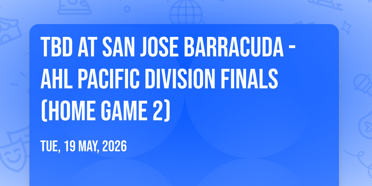 📍 Location: 37.3184, -121.863✨ Embark on an extraordinary journey at TBD at San Jose Barracuda - AHL Pacific Division Finals (Home Game 2), where every moment promises to be unforgettable! 🌟 Imagine of transforming Tech CU Arena in the heart of San Jose, CA into a realm of endless possibilities. 📅 Join us on May 19th, 2026 at 10:30 AM for an experience that will challenge your imagination and exceed your expectations. 🎯 This carefully curated event combines the finest elements of entertainment, innovation, and community spirit. Whether you're an adventure seeker, culture enthusiast, or someone looking for unique experiences, this event offers something special for everyone. 🎊 Don't miss this chance to be part of something extraordinary!