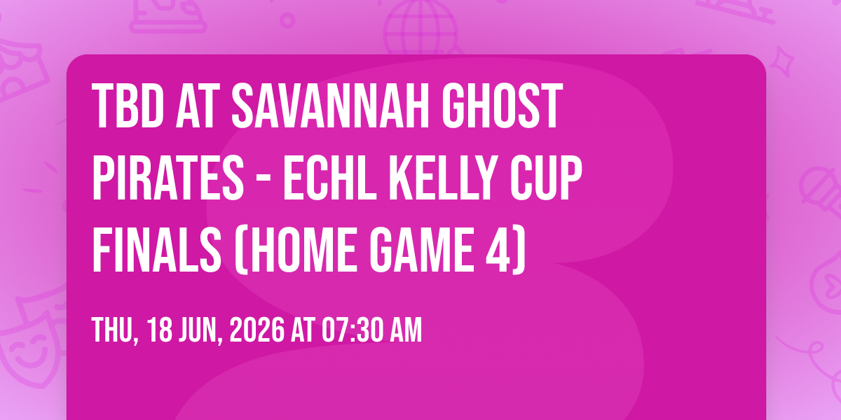 📍 Location: 32.0741, -81.1116✨ Discover the extraordinary at TBD at Savannah Ghost Pirates - ECHL Kelly Cup Finals (Home Game 4), where magic meets reality in ways you've never imagined! 🏛️ Set in Enmarket Arena nestled in bustling Savannah, GA, this event promises to be a landmark occasion. 📅 Taking place on June 18th, 2026 at 07:30 AM, it's going to create an atmosphere where every moment becomes a cherished memory. 🌟 Immerse yourself in an experience crafted with attention to every detail, designed to surprise and delight at every turn. They have worked tirelessly to ensure this event exceeds all expectations, bringing together elements of entertainment, innovation, and pure joy. 🎊 Don't miss your chance to be part of this remarkable journey!