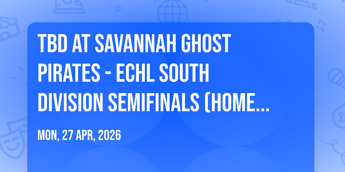 📍 Location: 32.0741, -81.1116✨ Embark on an extraordinary journey at TBD at Savannah Ghost Pirates - ECHL South Division Semifinals (Home Game 3), where every moment promises to be unforgettable! 🌟 Imagine of transforming Enmarket Arena in the heart of Savannah, GA into a realm of endless possibilities. 📅 Join us on April 27th, 2026 at 07:30 AM for an experience that will challenge your imagination and exceed your expectations. 🎯 This carefully curated event combines the finest elements of entertainment, innovation, and community spirit. Whether you're an adventure seeker, culture enthusiast, or someone looking for unique experiences, this event offers something special for everyone. 🎊 Don't miss this chance to be part of something extraordinary!