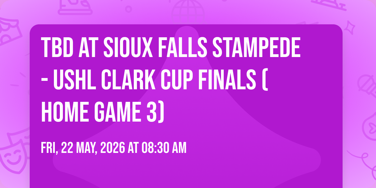 📍 Location: 43.5635, -96.747✨ Embark on an extraordinary journey at TBD at Sioux Falls Stampede - USHL Clark Cup Finals (Home Game 3), where every moment promises to be unforgettable! 🌟 Imagine of transforming Denny Sanford Premier Center in the heart of Sioux Falls, SD into a realm of endless possibilities. 📅 Join us on May 22nd, 2026 at 08:30 AM for an experience that will challenge your imagination and exceed your expectations. 🎯 This carefully curated event combines the finest elements of entertainment, innovation, and community spirit. Whether you're an adventure seeker, culture enthusiast, or someone looking for unique experiences, this event offers something special for everyone. 🎊 Don't miss this chance to be part of something extraordinary!