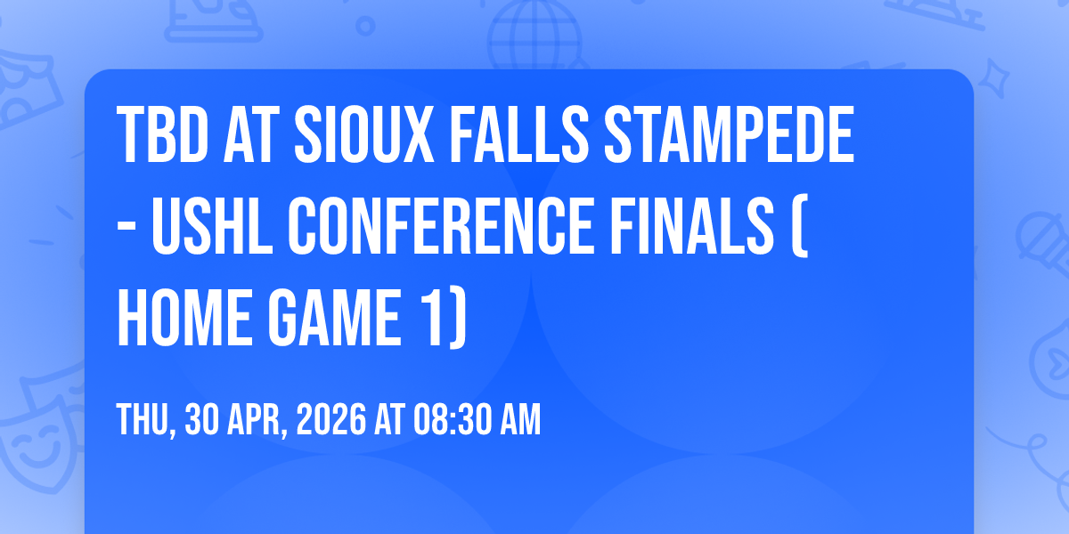 📍 Location: 43.5635, -96.747✨ Enter a world of endless possibilities at TBD at Sioux Falls Stampede - USHL Conference Finals (Home Game 1), where every moment tells a story! 🏛️ The stunning Denny Sanford Premier Center in vibrant Sioux Falls, SD transforms into a realm of wonder on April 30th, 2026 at 08:30 AM. 🌟 They have crafted an experience that goes beyond the ordinary, combining elements of surprise, delight, and pure entertainment. Every detail has been thoughtfully considered to ensure your journey with us is nothing short of extraordinary. 🎯 Join fellow adventure seekers and memory makers in this celebration of imagination and innovation. 🎊 Reserve your spot today and be part of something truly special!
