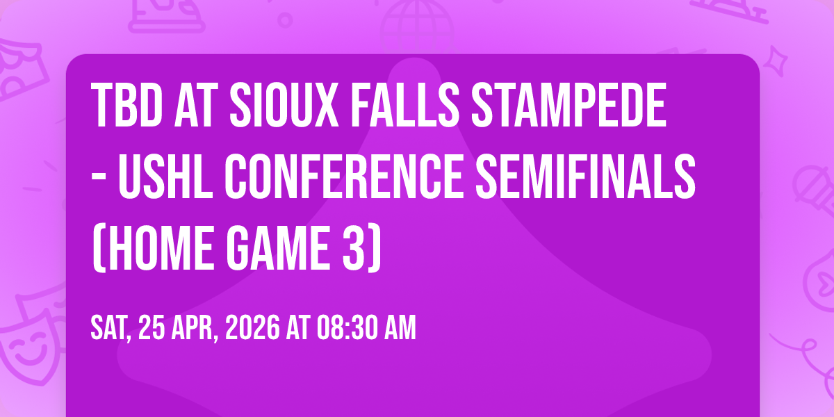📍 Location: 43.5635, -96.747🌟 Step into a world of wonder at TBD at Sioux Falls Stampede - USHL Conference Semifinals (Home Game 3), where extraordinary moments await! 🏛️ Located at Denny Sanford Premier Center in dynamic Sioux Falls, SD, this event will become the talk of the town. 📅 Join us on April 25th, 2026 at 08:30 AM for a celebration that defies the ordinary. ✨ This curated experience brings together the best of entertainment, culture, and community spirit. Every detail has been thoughtfully planned to ensure an unforgettable experience for all our guests. 🎯 Take advantage of this opportunity to be part of something special. 🎊 Early registration is recommended as space is limited!