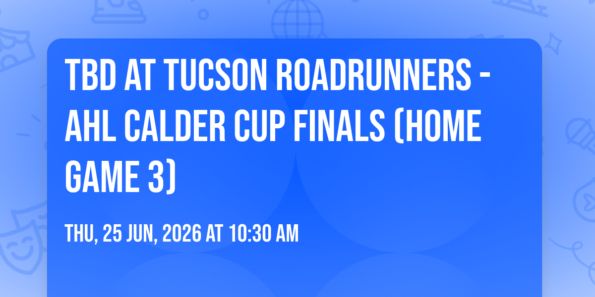 📍 Location: 32.2188, -110.973🌟 Be part of history at TBD at Tucson Roadrunners - AHL Calder Cup Finals (Home Game 3), an extraordinary gathering that will captivate your imagination! 🏛️ The prestigious Tucson Arena in Tucson, AZ sets the stage for an unforgettable experience on June 25th, 2026 at 10:30 AM. ✨ They are bringing together the finest elements of entertainment and innovation to create moments that will take your breath away. From the moment you arrive, you'll be immersed in an atmosphere of wonder and excitement. 🎯 This carefully planned event ensures every guest experiences something truly special. 🎊 Early booking is recommended for this must-attend event of the season!