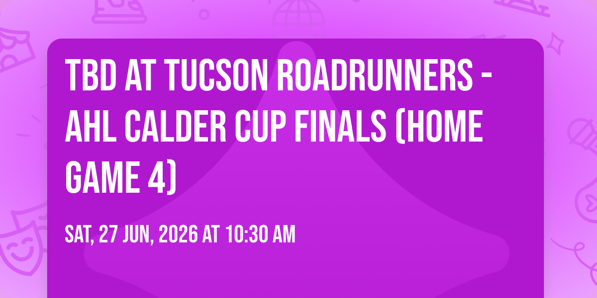 📍 Location: 32.2188, -110.973✨ Discover the extraordinary at TBD at Tucson Roadrunners - AHL Calder Cup Finals (Home Game 4), where magic meets reality in ways you've never imagined! 🏛️ Set in Tucson Arena nestled in bustling Tucson, AZ, this event promises to be a landmark occasion. 📅 Taking place on June 27th, 2026 at 10:30 AM, it's going to create an atmosphere where every moment becomes a cherished memory. 🌟 Immerse yourself in an experience crafted with attention to every detail, designed to surprise and delight at every turn. They have worked tirelessly to ensure this event exceeds all expectations, bringing together elements of entertainment, innovation, and pure joy. 🎊 Don't miss your chance to be part of this remarkable journey!
