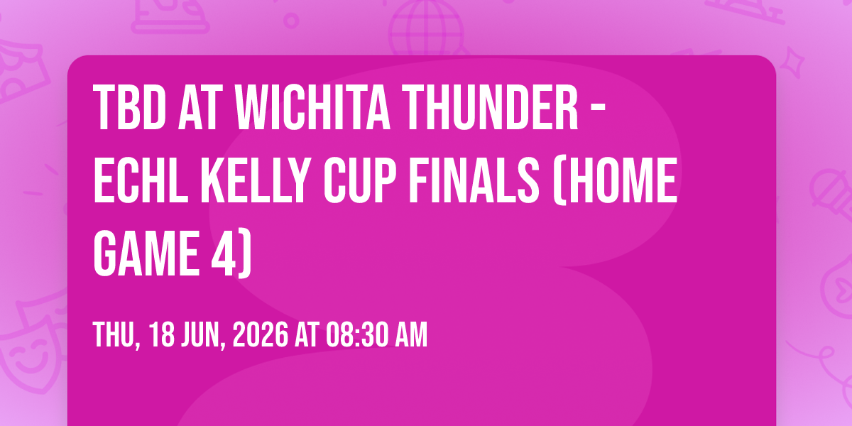 📍 Location: 37.6834, -97.3318🎉 Welcome to TBD at Wichita Thunder - ECHL Kelly Cup Finals (Home Game 4), where the impossible becomes possible and dreams take flight! 🏛️ Join us at INTRUST Bank Arena in the heart of Wichita, KS for an event that will redefine your expectations. 📅 On June 18th, 2026 at 08:30 AM, witness the transformation of space and time into something truly magical. ✨ It's a curated experience combining the best of innovation, entertainment, and community spirit, creating moments that will be remembered for years to come. Whether you're a first-time visitor or a seasoned enthusiast, prepare to be amazed. 🎊 Book now to ensure your place in this unforgettable experience!