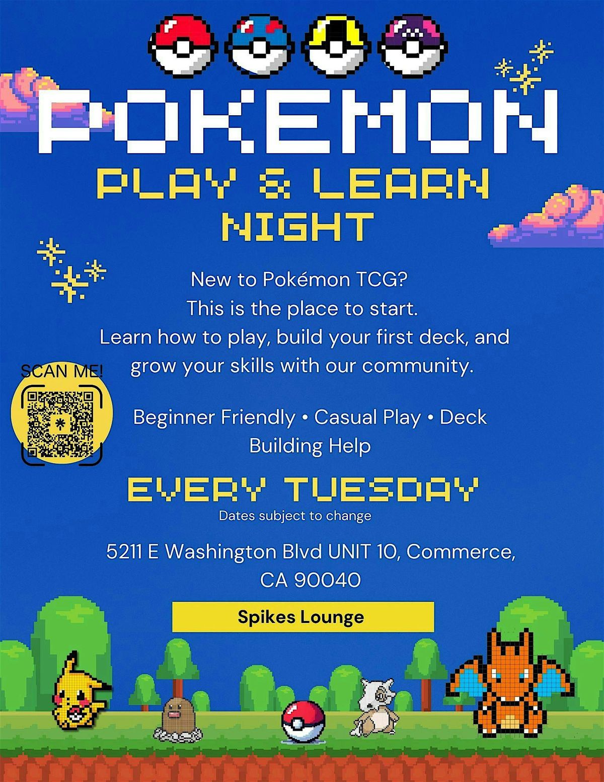 Join us every Tuesday at Spikes Lounge for Pokémon Beginner Night — a relaxed, beginner-friendly environment designed for new players, returning trainers, and anyone looking to enjoy casual play.