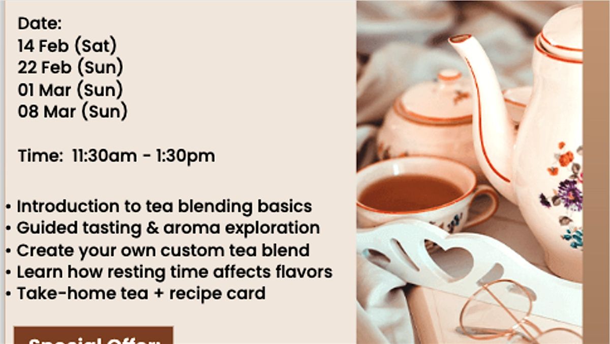 Join our small, hands-on experience where you’ll create your own custom tea blend and learn how flavors develop over time.