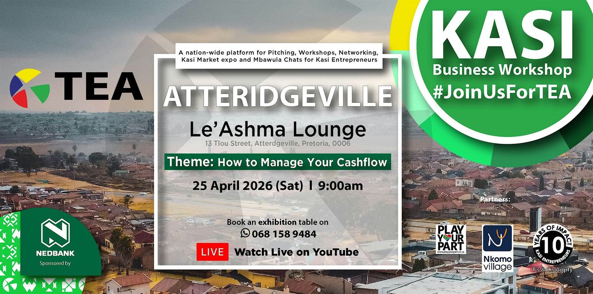 #JoinUsForTEA at the Kasi Business Workshop in Atteridgeville, Pretoria. Our Masterclass theme is How to Manage Your Cashflow. The session will focus on helping business owners take control of their finances by understanding the flow of money in and out of their businesses, prioritising income stability and planning ahead with intention. Participants will gain insight into monitoring expenses, protecting profit margins, limiting unnecessary costs and using financial tools to strengthen decision making. The session will also address the importance of separating personal and business finances, introducing simple systems for tracking income and expenditure and building the discipline of forecasting to anticipate challenges and opportunities. Expect impactful Masterclasses, Kasi Business Exhibition, Kasi Pitching Challenge, Networking and Mbawula Chat inspiration. Impacting Kasi entrepreneurs one township at a time.