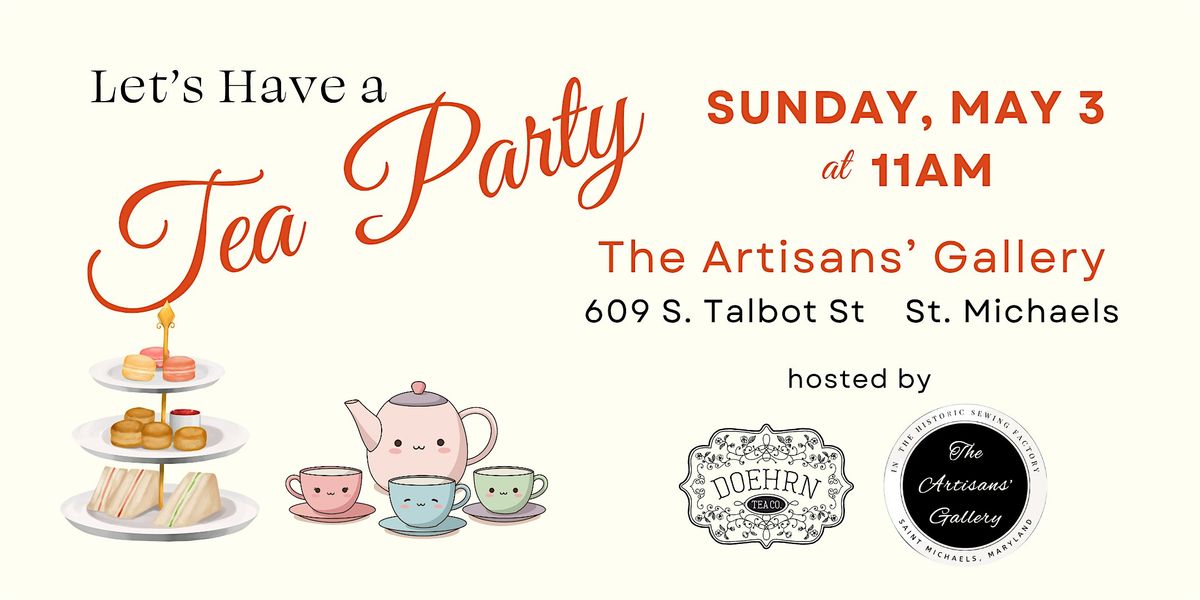 Join us for a fun tea party at the Artisans Gallery in St. Michaels! It's happening on Saturday, May 3, 2026 at 11:00 AM. Enjoy great company, tasty teas, and a creative atmosphere. Whether you're a tea lover or looking for a reason to wear that new hat, this is the place to be. Finger sandwiches, scones, petite sweets served on a tiered stand with china tea pots and all the sparkle. Kids are welcome with their adults.