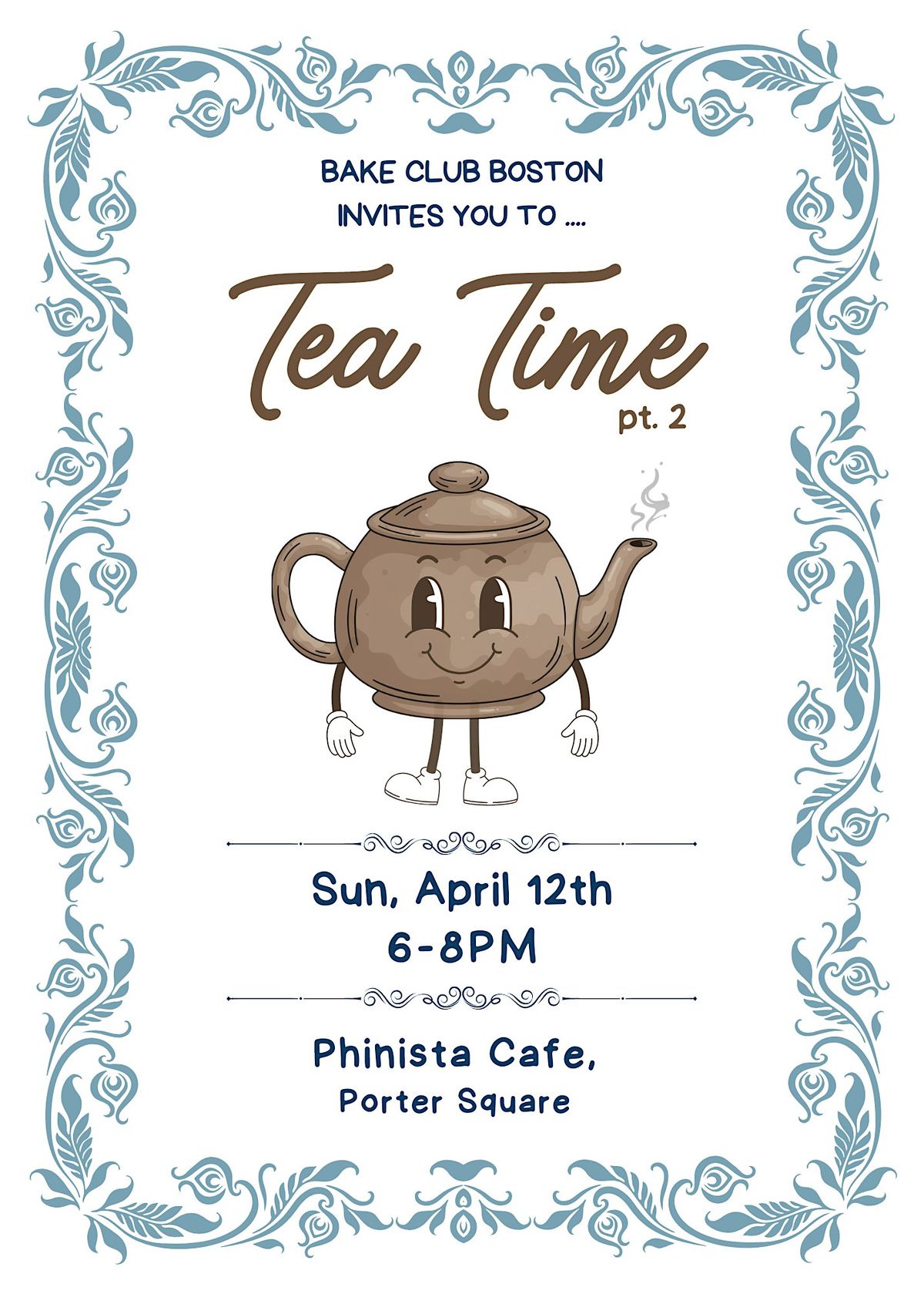 Bring a homemade baked good (sweet or savory) inspired by items or flavors you'd find at a tea party. Leave with a box full of other treats and maybe some new friends and recipes too!