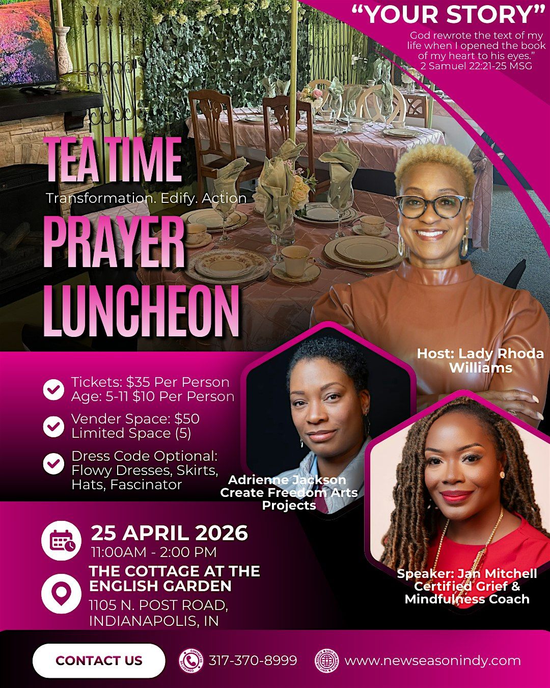 What will the title be to the next chapter of Your Story? It's time to turn that page and begin to see your life through the eyes of God. Come dressed in that flowy dress, skirt, hat or facinator and enjoy TEA Time with other awesome ladies.