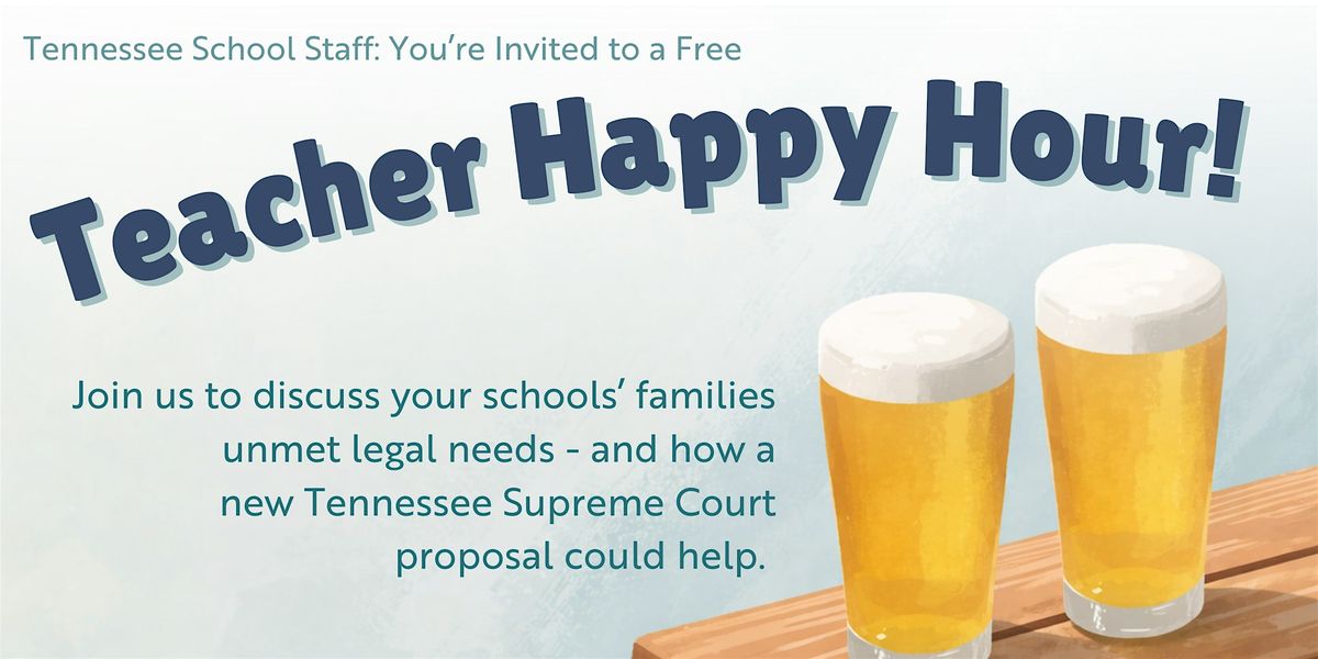 Join us for FREE drinks and snacks! We will discuss the Tennessee Supreme Court’s proposal to expand options for affordable legal help. We want to hear from teachers and educational professionals about legal issues they’ve encountered in their classrooms and in their own lives. Come to learn more about this exciting opportunity!