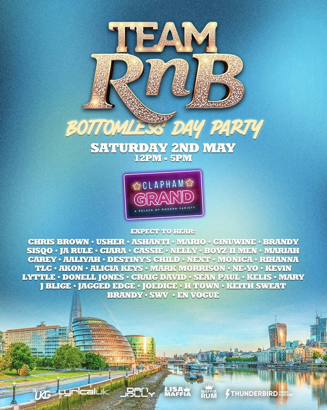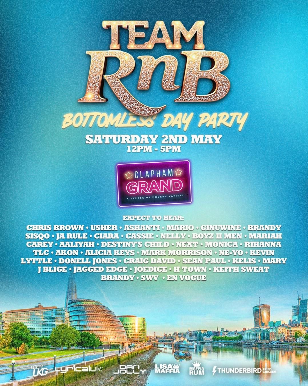 Lisa & Dan events are super excited to announce the Team RnB bottomless & day party This event is held on Saturday 30th May 2026 at Clapham Grand 12pm - 5pm