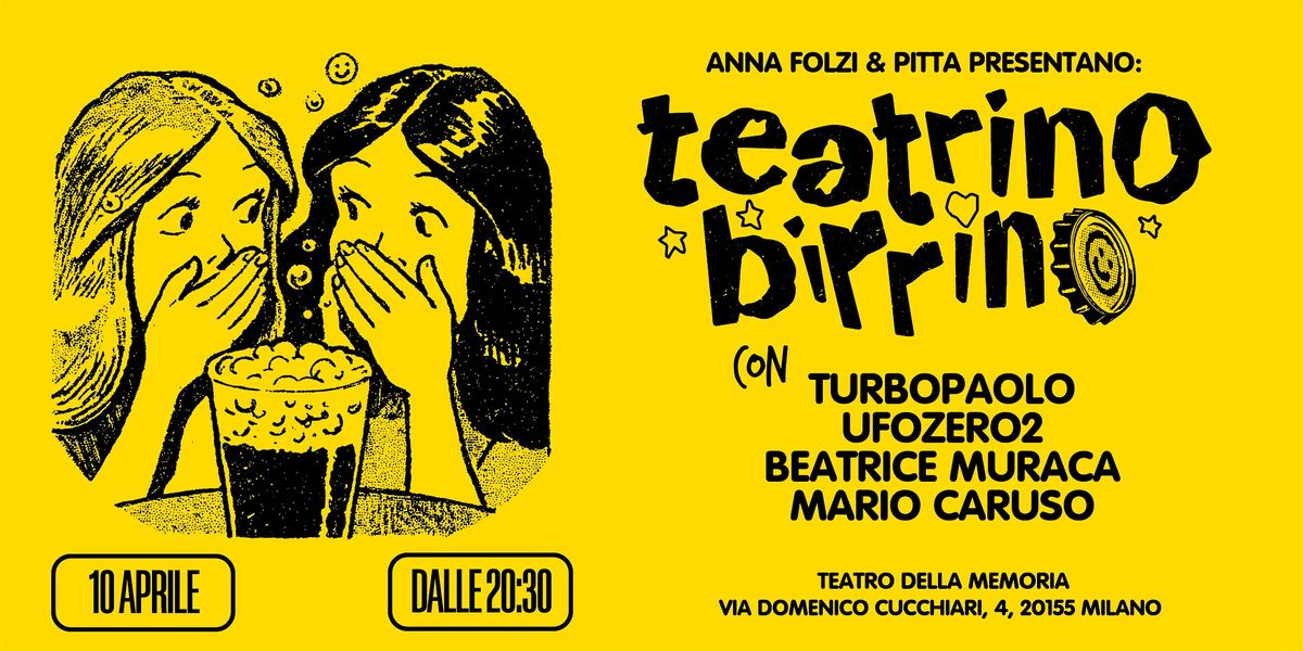 Teatrino Birrino è un comedy show che unisce stand-up e sketch comedy, condotto da Pitta (Margherita Pontecorvo) e Anna Folzi (Folza), con ospiti diversi a ogni serata. Il 10 aprile saranno con noi TurboPaolo, UfoZero2, Mario Caruso e Beatrice Muraca.
