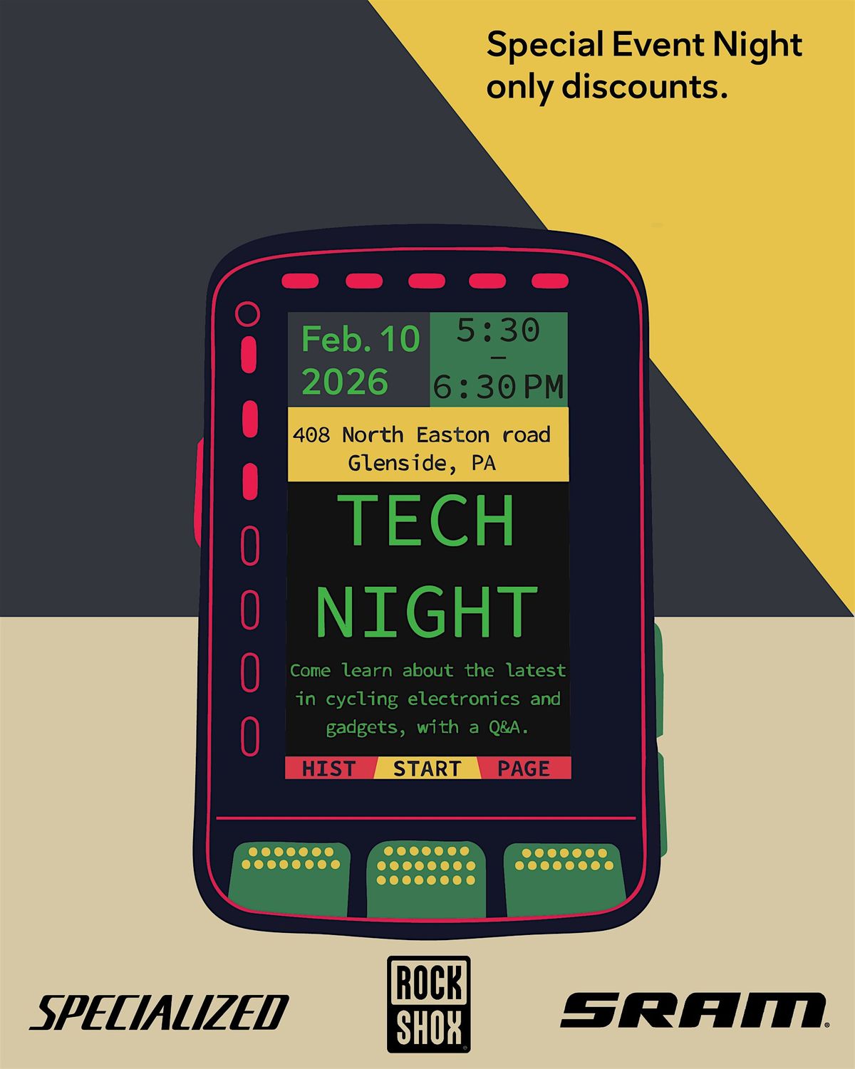 Join us for an exciting evening with brand representatives from Specialized, SRAM, and RockShox as they showcase the latest and greatest in cycling technology.