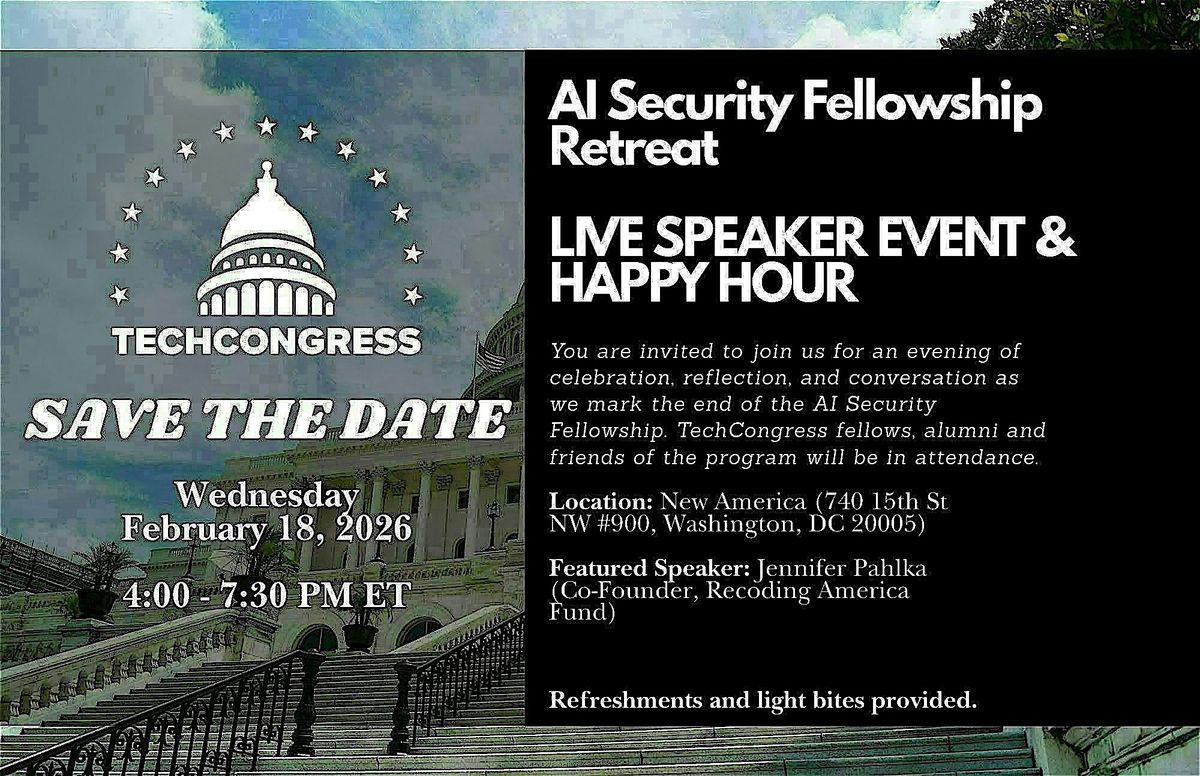 Join TechCongress on Wednesday, February 18th from 4:00-7:30 PM ET at New America to celebrate the conclusion of the AI Security Fellowship.About this Event