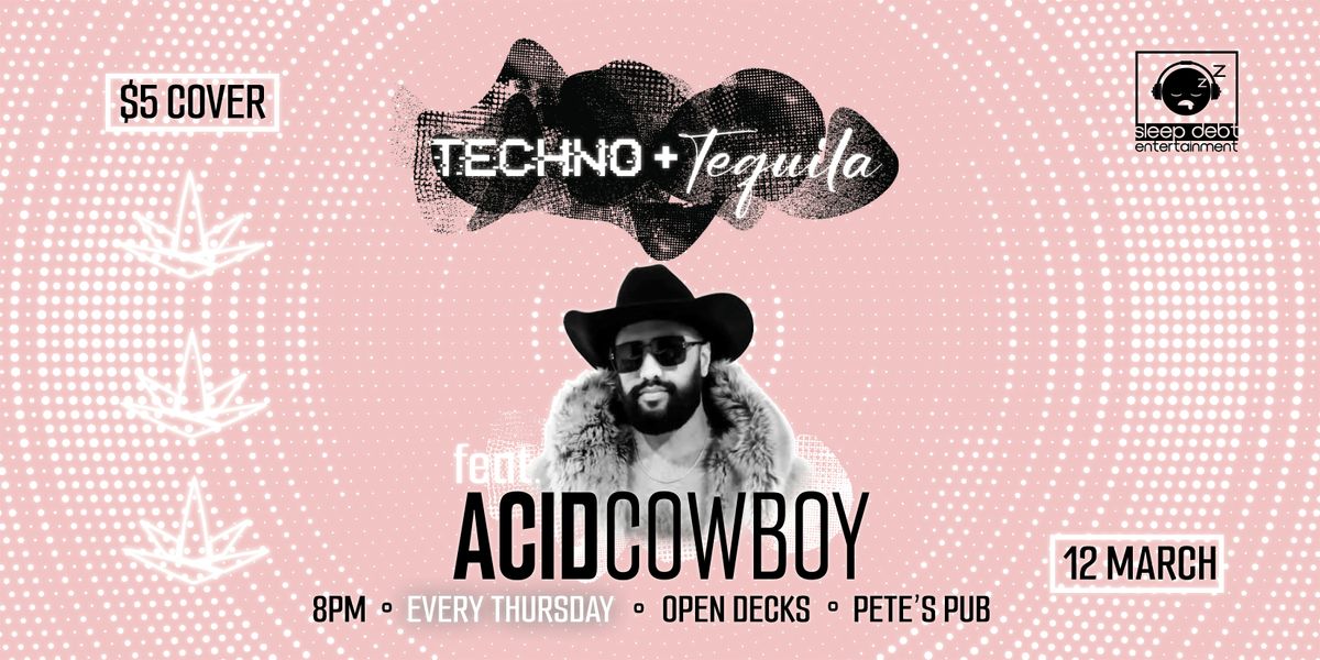 Our second iteration of Techno and Tequila Thursdays at Pete’s Pub kicks off on March 12th with Acid Cowboy bringing heavy hitting techno with a house backbone! He’ll be spinning from 10pm-11pm! We can’t wait to vibe with him!