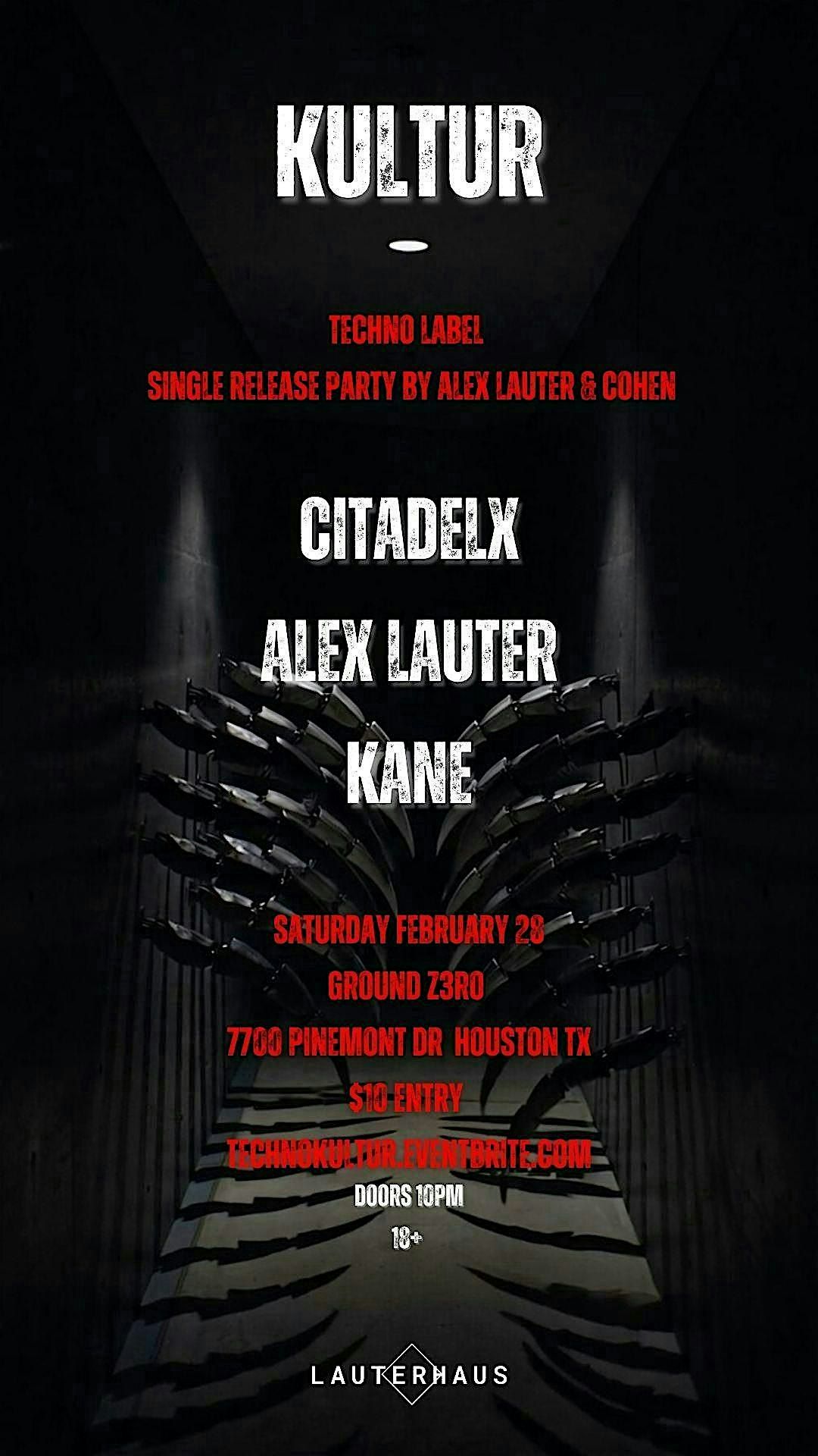 Alex Lauter, founder of Lauterhaus Records based in Houston Texas, presents the first single release party of his new German Techno Label "Kultur" & single "Amschwersten", a record both Alex & fellow Houstonian EDM producer Cohen worked on together for over 2 years & are ready to unleash to the world now - experience a night of hard hitting techno at a proper Houston underground venue, Ground Zero, with the lineup featuring CitadelX, Alex Lauter, & Kane