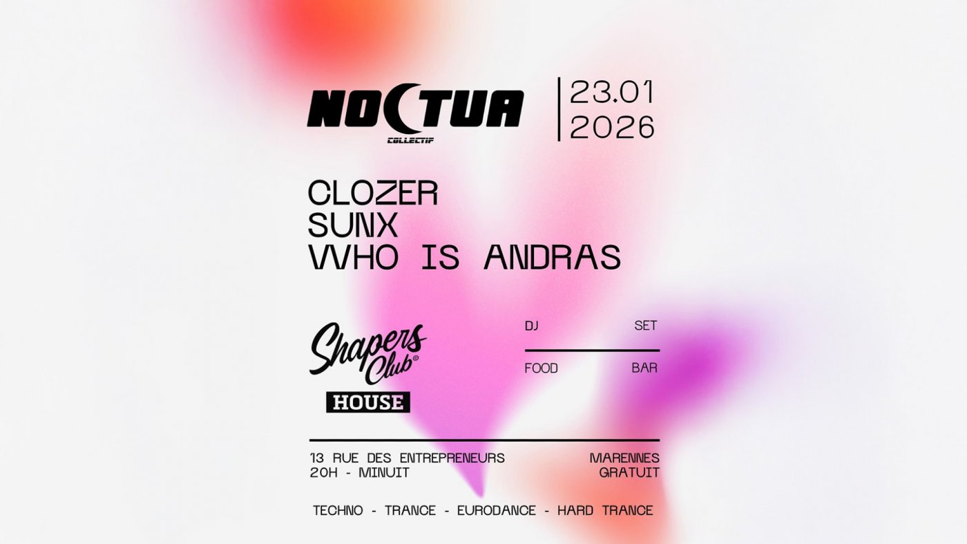 Soirée électro explosive avec le collectif NOCTUA, association de musiques électroniques basée à Royan en Nouvelle-Aquitaine. NOCTUA a pour mission de développer la culture rave dans le pays royanais et au-delà, en organisant des événements techno underground qui rassemblent les amateurs de sons électroniques puissants. Le collectif a déjà fait vibrer le Shapers Club House lors de précédentes éditions, créant une synergie parfaite entre l'esprit alternatif du lieu et l'énergie brute de la scène rave.