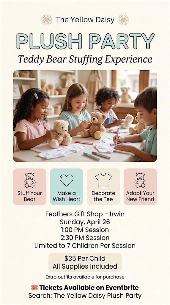 Boutique teddy bear stuffing workshop at Feathers in Irwin! Two small-group sessions. $35 includes bear, tee & wish heart.