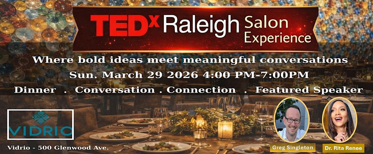 This special TEDxRaleigh Salon brings together curious minds, community leaders, creatives, and professionals for a shared experience centered on meaningful dialogue and bold ideas. Set against the stunning backdrop of Vidrio’s iconic blown-glass art wall, guests will enjoy a thoughtfully curated gathering designed to spark inspiration and foster authentic connections. Be around like minded-people!?