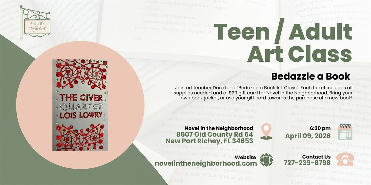Join us for a night of literary fun as art teacher Dara Tucker leads a class on bedazzling a book! Each $45 dollar ticket includes all art supplies needed and a $20 gift card for Novel in the Neighborhood. Bring your own book jacket, or use your gift card towards the purchase of a new book.