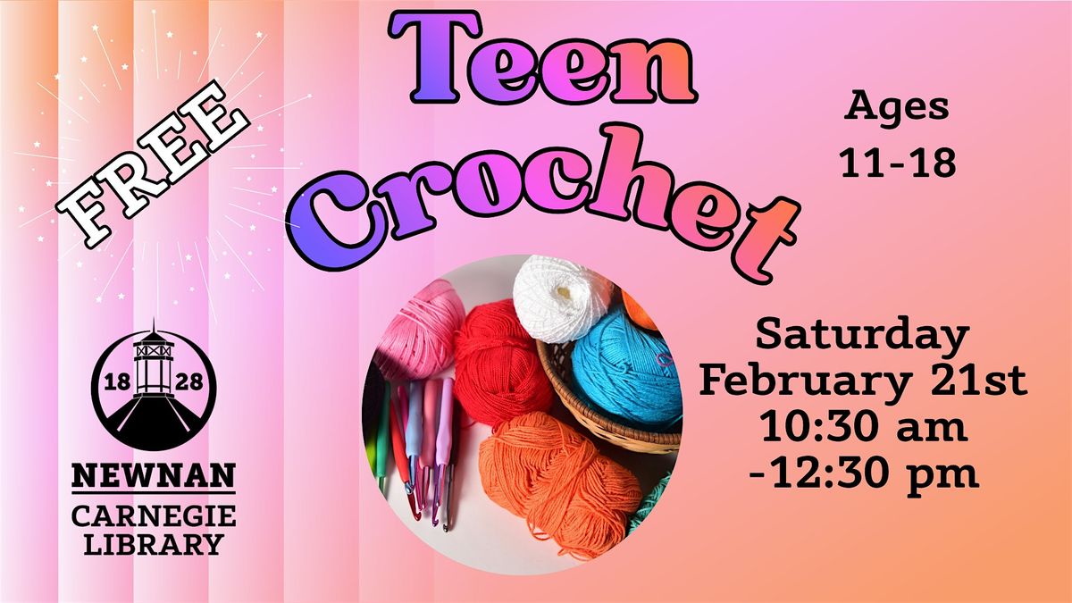 Join us at the Newnan Carnegie Library for our ongoing Teen Crochet Club. Free to the public for ages 11-18. We will have an instructor on hand to help beginners get started or to help you learn an advanced skill. Please bring a size H crochet hook and one skein of Red Heart yarn, or any project you are currently working on.