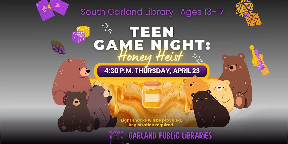 It’s game night! Tonight we’ll be playing Honey Heist, a tabletop role-playing game (TTRPG) where you play as a bear trying to sneak into the annual HoneyCon and steal a lifetime supply of honey without getting caught. No previous TTRPG experience required! Light snacks will be provided. This program is for teens, ages 13-17.