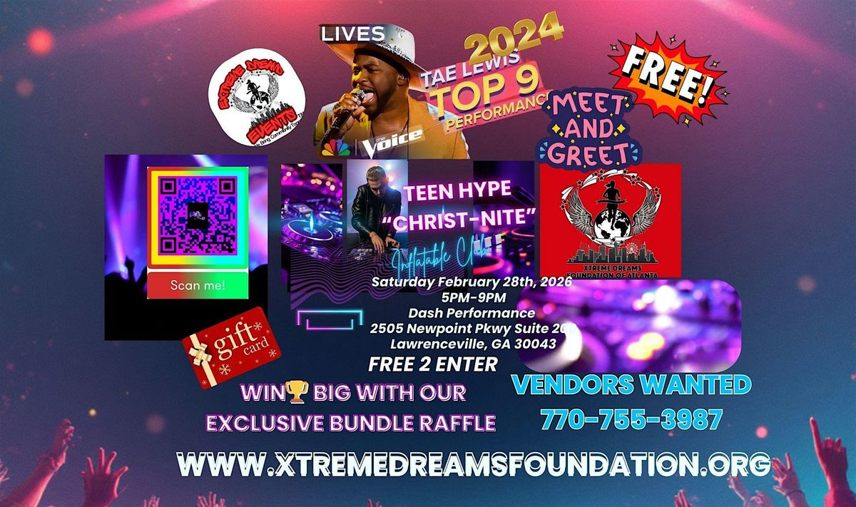 #TeenHype #ChristNite #Christian Music #DashPerformance #InflatableClub #FamilyFun #CleanBeats #FreeEntry #LawrencevilleEvents #XtremeDreamsFoundation #TeenDanceParty #SiblingFun #VendorsWanted