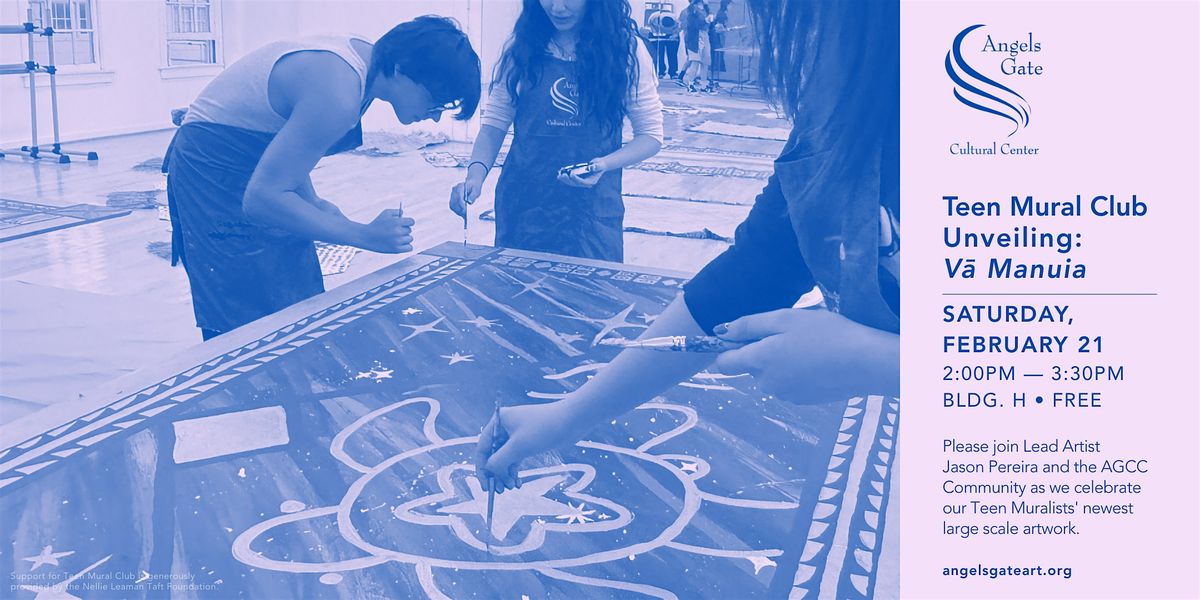 We are thrilled to announce the 4th Teen Mural Club Unveiling Event on Saturday, February 21, 2026! We are incredibly proud of and grateful for our Teens participation over the past 10 weeks, working alongside artist & muralist Jason Pereira (JP) to create Angels Gate Cultural Center’s newest mural, “Vā Manuia”.
