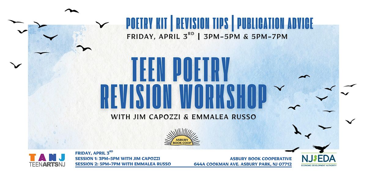 There will be two sessions of a TEEN POETRY REVISION WORKSHOP with two amazing published poets; Jim Capozzi and Emmalea Russo. This is a chance to work with your peers, have professionals read your work, and walk away with revision tips and publication advice!