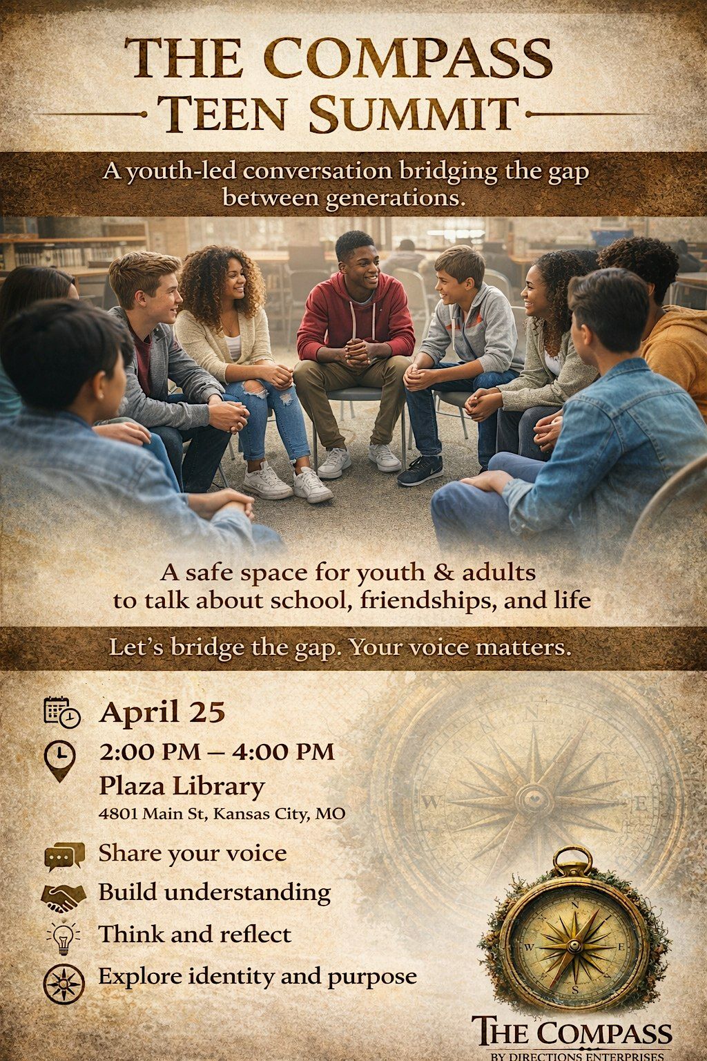The Compass Teen Summit is a youth-centered conversation designed to bring teens and adults together through listening, understanding, and real dialogue.
